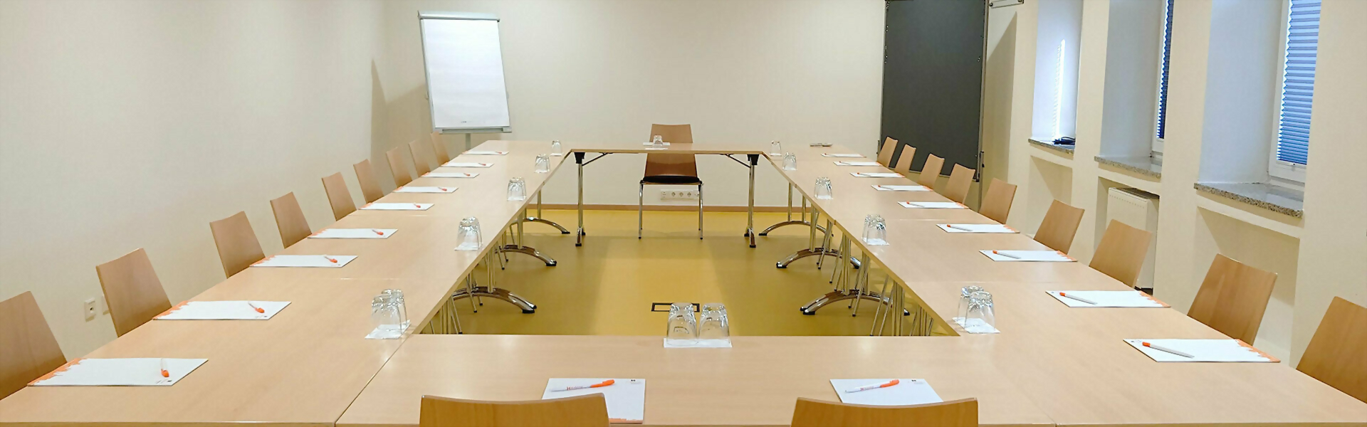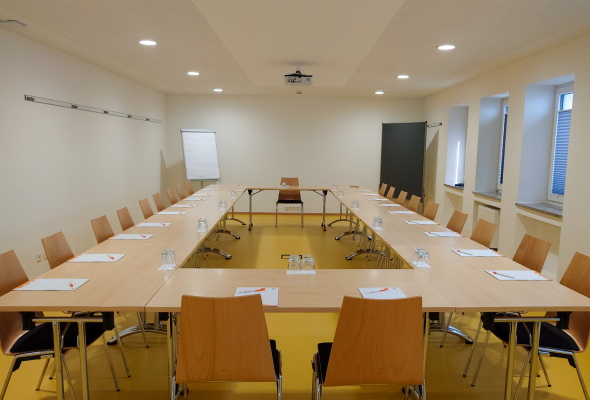 Raum Augsburg ist ein ruhiger Tagungsraum im 1. OG mit abgehängtem Beamer und eigenem oberen Foyer für Kaffeepausen.