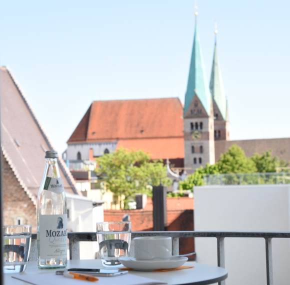 Raum Domblick ist ein barrierearmer, lichtdurchfluteter Tagungs- und Besprechnungsraum mit Balkon und Blick auf den Augsburger Dom.